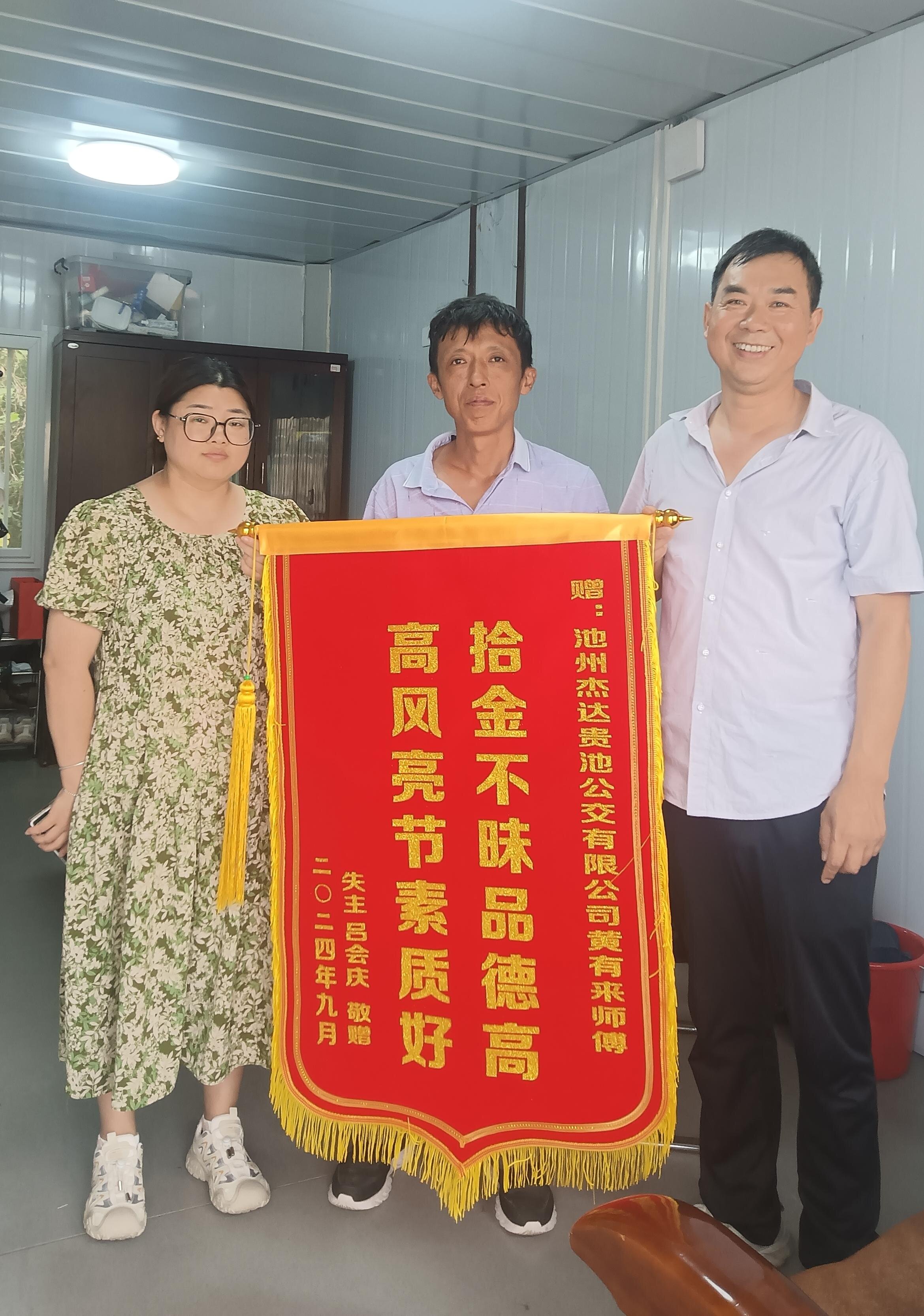 2024年9月12日下午,池州杰達貴池公交公司收到了來自上海呂會慶先生委托其朋友送來的一面錦旗。經(jīng)了解,2024年9月9日下午,公交駕駛員黃有來師傅在執(zhí)行完花廟至貴池的班次任務(wù)車輛入庫后,在打掃衛(wèi)生時發(fā)現(xiàn)后座上有一手提袋,外面散落了大量現(xiàn)金,黃有來師傅即刻將手提袋及現(xiàn)金交到調(diào)度室。失主在收到丟失物品后非常激動,送來錦旗以表謝意。黃有來作為一名普通的公交駕駛員,在崗位上展現(xiàn)出拾金不昧的精神,不僅體現(xiàn)了個人高尚的道德品質(zhì)和社會責任感,也傳遞了社會正能量。