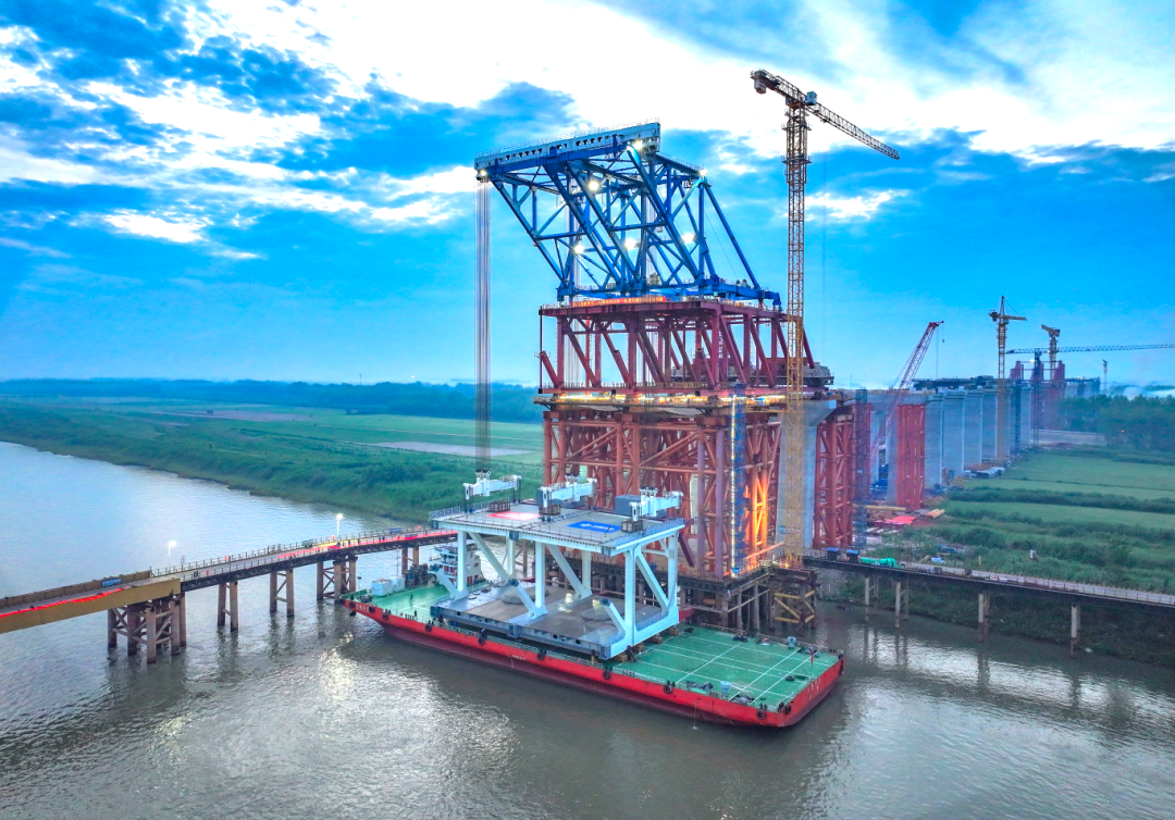 大橋連接銅陵市樅陽縣和池州市貴池區(qū),全長3108.5米,采用上層6線高速公路、下層2線高速鐵路和預留2線城際軌道布局,其中跨江主橋長1768米,采用主跨812米雙層鋼桁梁斜拉橋,主橋共計69個節(jié)段,總重91448.6噸。