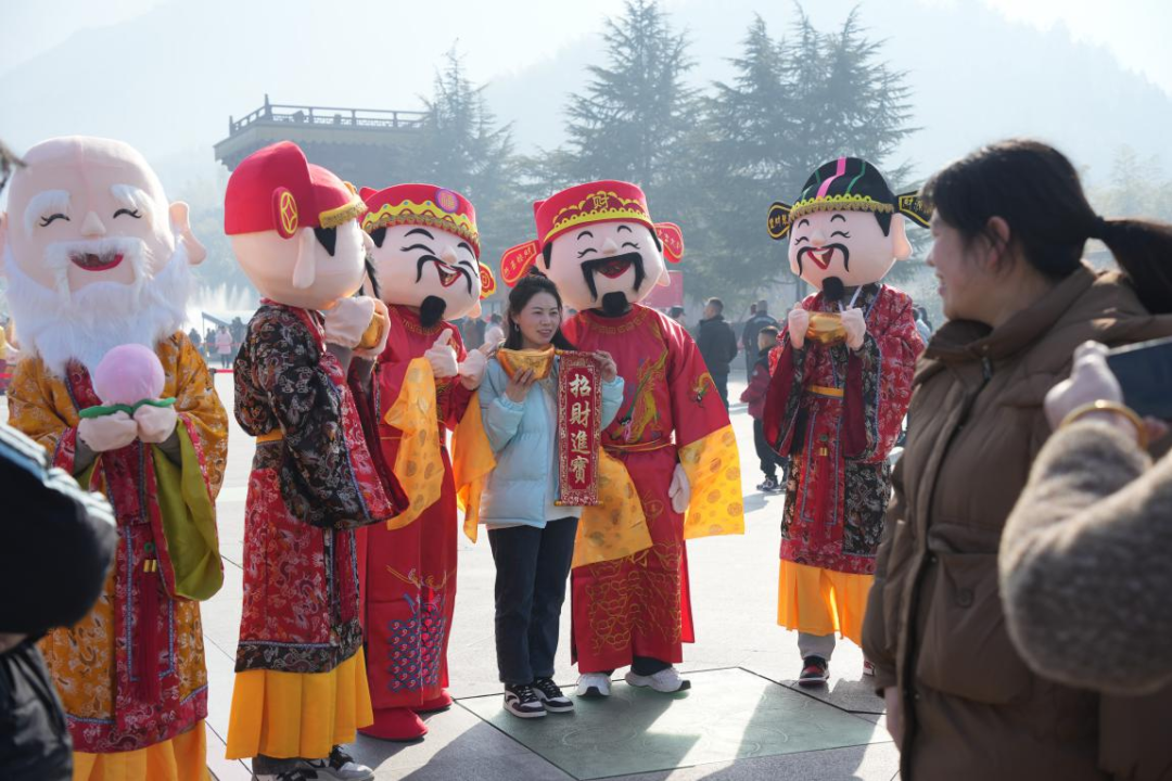 五路財(cái)神送祝福。新春佳節(jié)期間,分別在景區(qū)內(nèi)設(shè)有“福、祿、壽、喜、財(cái)”五個(gè)送福打卡點(diǎn),吉祥物們不定時(shí)在園區(qū)巡游,并為游客朋友們送上真摯的龍年祝福。大小朋友們也是追著福星排隊(duì)拍照打卡,現(xiàn)場(chǎng)呈現(xiàn)出一片人潮涌動(dòng)的祥和景象。